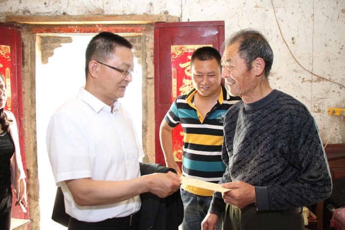 图为校长崔新有慰问低收入农户并送上慰问金