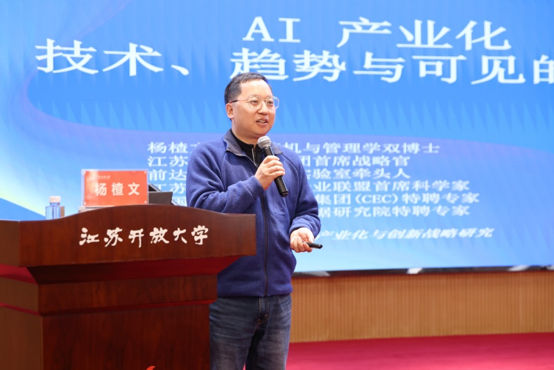 3月13日,我校“三千江苏开放教授”首期讲座暨第二十二期教育数智化系列论坛在定淮门校区圆满举办。江苏华博实业集团首席战略官、江苏省独角兽瞪羚企业联盟首席科学家杨楂文博士作为首期嘉宾,作《AI产业化:技术、趋势与可见未来》专题报告。全体在校校领导、中层干部、系主任、教师代表等200余人参加报告会,报告会由党委书记丁荣余主持。